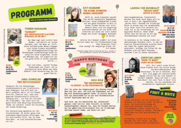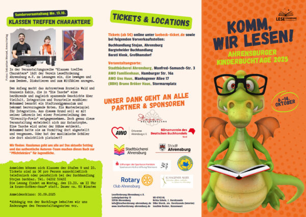 Die dritten Ahrensburger Kinderbuchtage fanden vom 06. – 14. 10. 2025 statt! Mehr als siebenhundert kleine und große Besucher^innen entdeckten die Magie der Bücher und tauchten ein in Welten voller Phantasie. Tolle Gäste, spannende Geschichten und kreative Workshops für Kids ab 5 Jahren!